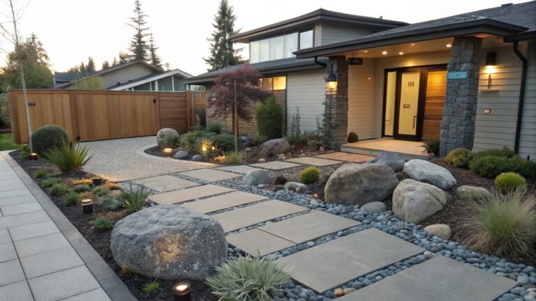 This works best in modern or craftsman-style homes where you want curb appeal without constant mowing. Lay the pavers irregularly for a casual flow, source boulders locally to match your area, and add a few tough grasses or sedums. Skip it if your yard floods, since gravel drains fast but can shift.