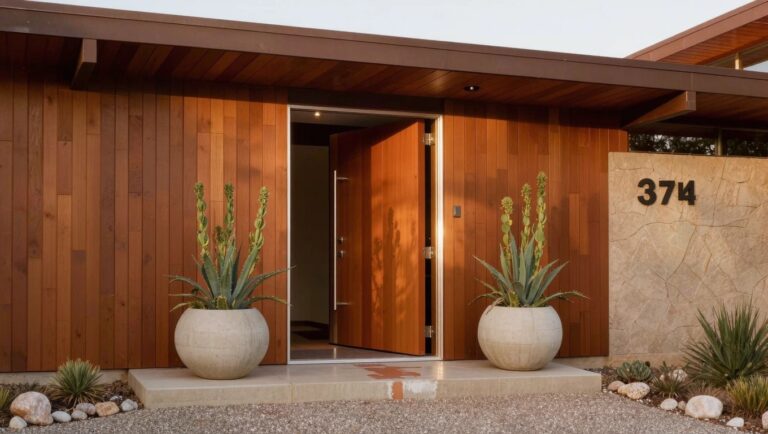 Large pots placed right next to the front door give your entry a solid, planted look. These concrete ones holding agave plants stand about as tall as the door handle. They fill the space without crowding it and bring some green to a simple stucco and wood setup. Folks notice them first when they pull up.