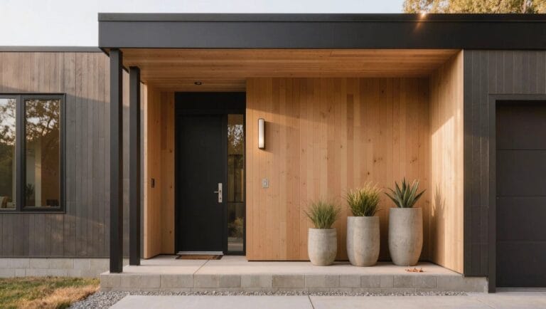 Tall boxwood plants in slim black pots sit right beside these wooden entry stairs. They bring in some green that fits the plain white walls and dark base without cluttering things up. The straight shapes match the house’s clean style, and the pots blend with the black door and trim.